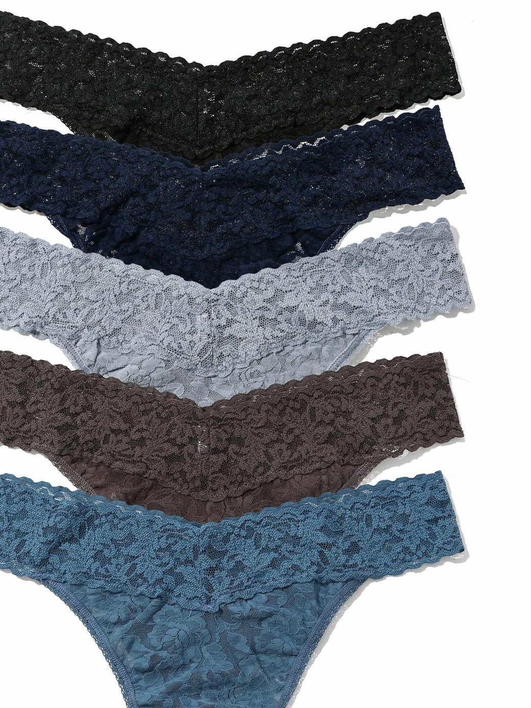 - 5 pack of one-size thongs in our signature stretch lace